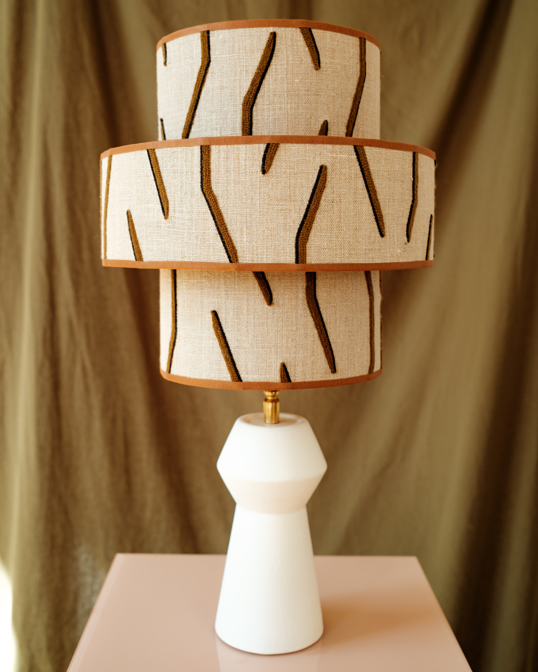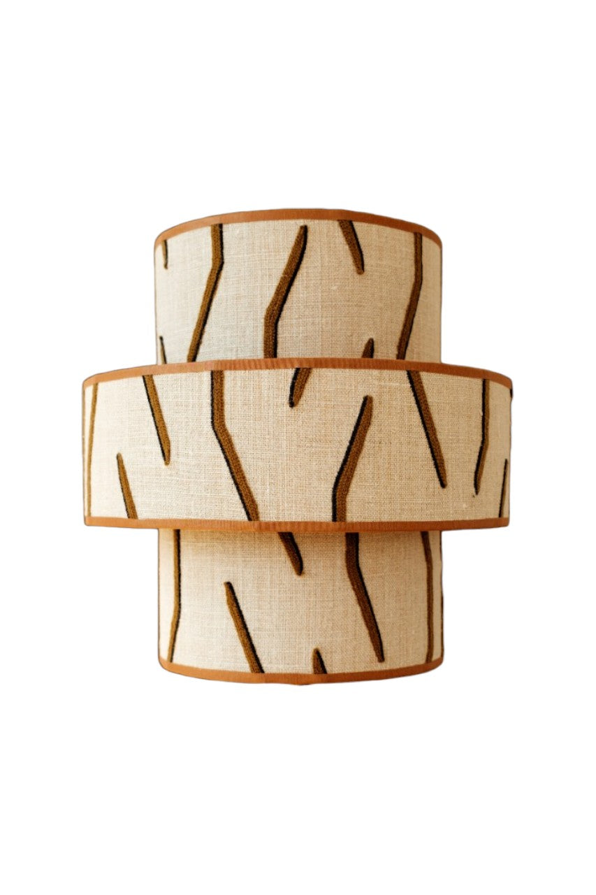 Deze handgemaakte lampenkap van de exclusieve ‘Lalla’ stof van Pierre brengt verfijning en zachtheid samen in één uniek ontwerp. De rijke textuur van de stof, in combinatie met de unieke vorm van drie lagen zorgt voor een uniek design.