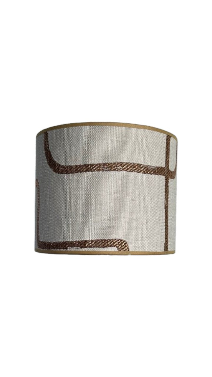 Deze unieke lampenkap is bekleed met de Dedar-stof ‘Promenade Kafkaïenne’ . Een expressief, grafisch dessin dat direct de aandacht trekt. De combinatie van de luxueuze stof met een gouden binnenkant en een verfijnde gouden bies maakt dit ontwerp tot een waar kunstobject. Perfect voor wie durft te kiezen voor karakter, kwaliteit en een flinke dosis elegantie.